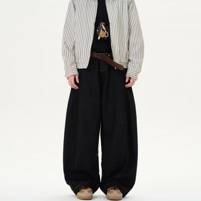 レトロデニムブラックワイドレッグカーブジーンズ、メンズとレディースのアメリカン万能ストレートレッグルーズカジュアルパンツ