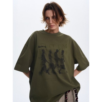 レトロなハイストリートの古いウォッシュプリントTシャツ、男女兼用、ゆったりとしたハンサムなヴィンテージデザインの半袖