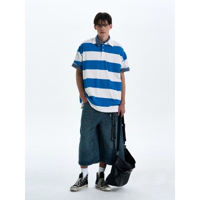 レトロなウォッシュ加工の竹ストライプ柄の7クォータージーンズ。ゆったりとしたストレートレッグデザインで、男女兼用。カジュアルパンツ。